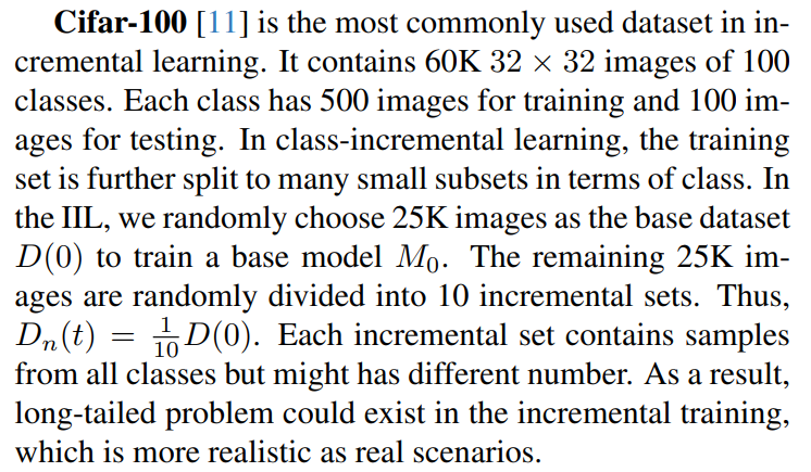 Corresponding to the definition of our new increment-alinstance learning (IIL) task, we reorganize the public dataset Cifar-100 [11] and ImageNet-100 [24] to establish the benchmark in this research topic.