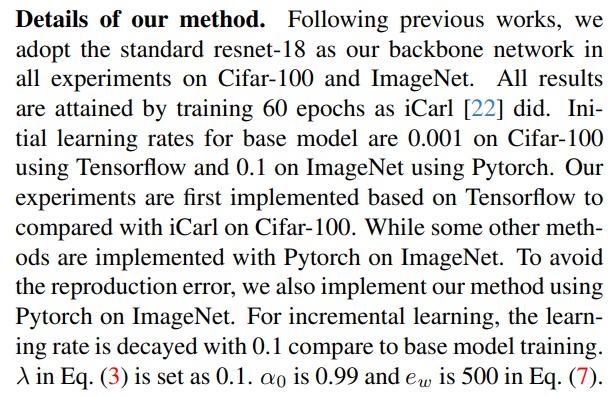 For LwF [12], as there is no need to add new classification head, we directly implement their training loss on the old classification head. iCarl [22] is implemented using their provided codes on Tensorflow. PODNet [4] and Der [31] are implemented based on their own codes using Pytorch. For online learning [6], we reproduce it only using the part that is related to learning from new instances of old classes in the first training phase. ISL [13] is also implemented based on its original codes with the original setting of the learning rate, i.e. lr=0.05 for the base training and lr=0.005 for the IIL learning phase. OnPro [29] utilize a quite strong data augmentation during training, which leads to a slightly low accuracy of the based model compared to other methods. As OnPro trains the base model for