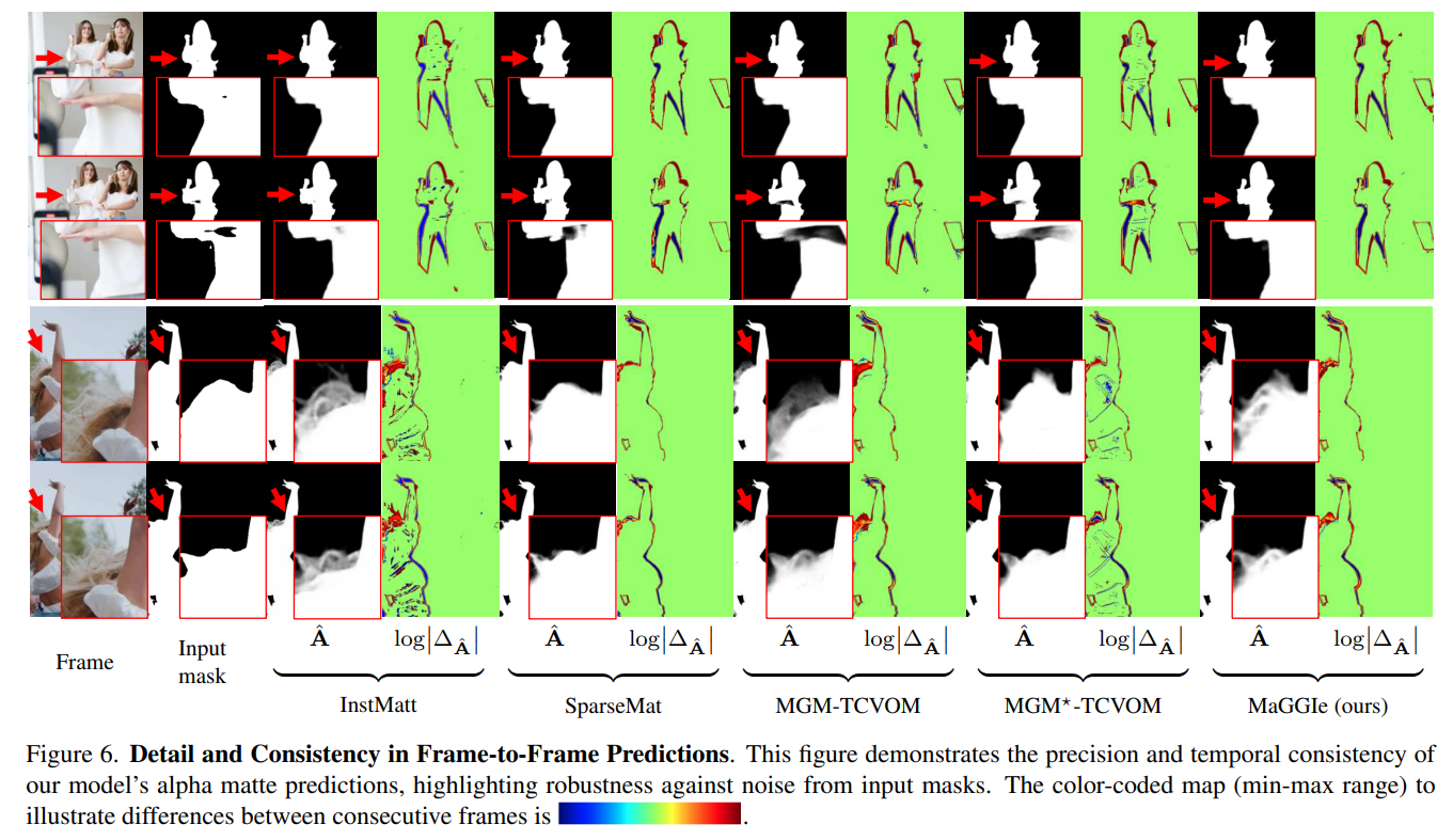 These aspects underscore MaGGIe’s robustness and effectiveness in video instance matting, particularly in maintaining temporal consistency and preserving fine details across frames.
