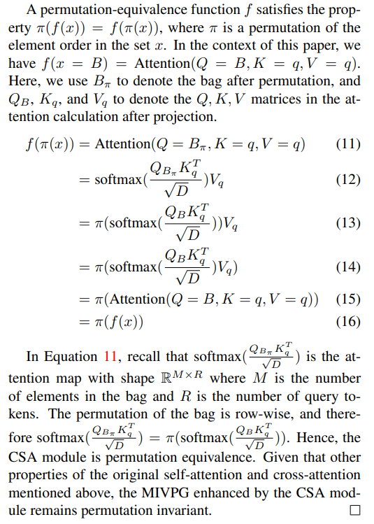 Proof. Recall that both the original cross-attention and self-attention mechanisms have already demonstrated permutation equivalence for the visual inputs (Property 1 in [19] and Proposition 1 in the main paper). Our objective is to establish that the CSA module also maintains this permutation equivalence, ensuring that the final query embeddings exhibit permutation invariance.